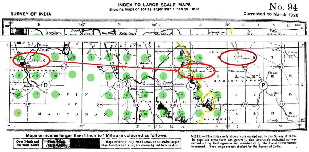 - Survey of India, Index to large scale maps, No. 94 corrected to Mar 1928; reference required; my ref: \03200 Sakpinit P books\Maps\Burma with TH\00,00 094 Index–Survey of India 63k and 50k 6-23 part.jpg[↩]
