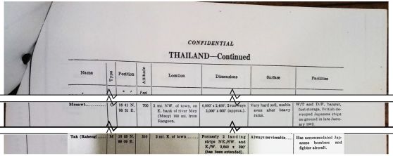 - Note that the air facility at Mae Sot was reconfigured after the war, and that at Tak was moved about 11 km easterly along Thai Route 12 after the war to its present-day location.[↩]