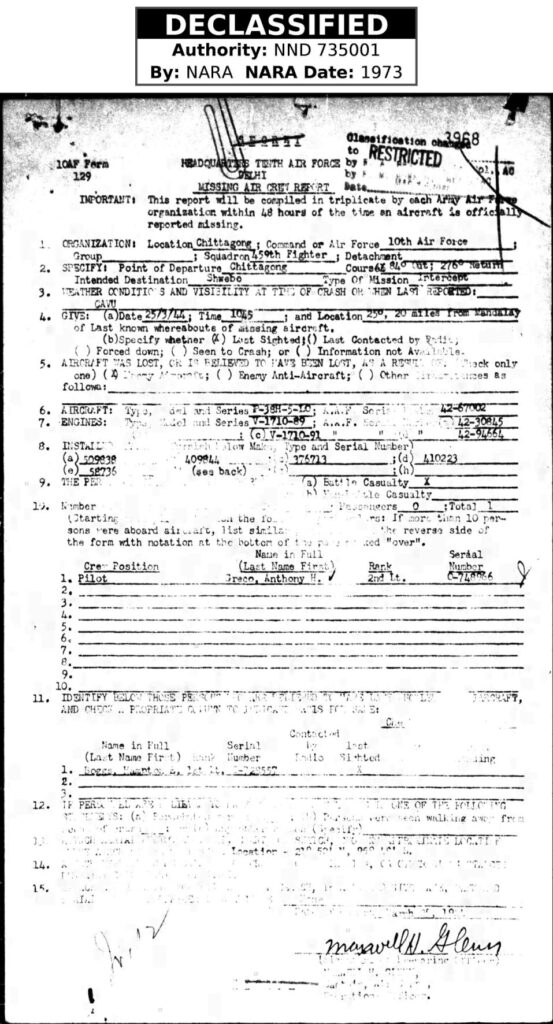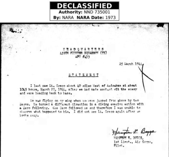 I last saw Lt Greco about 40 miles West of Anisakan at about 1045 hours, March 25, 1944, after we had made contact [with] the enemy and were heading back to base.