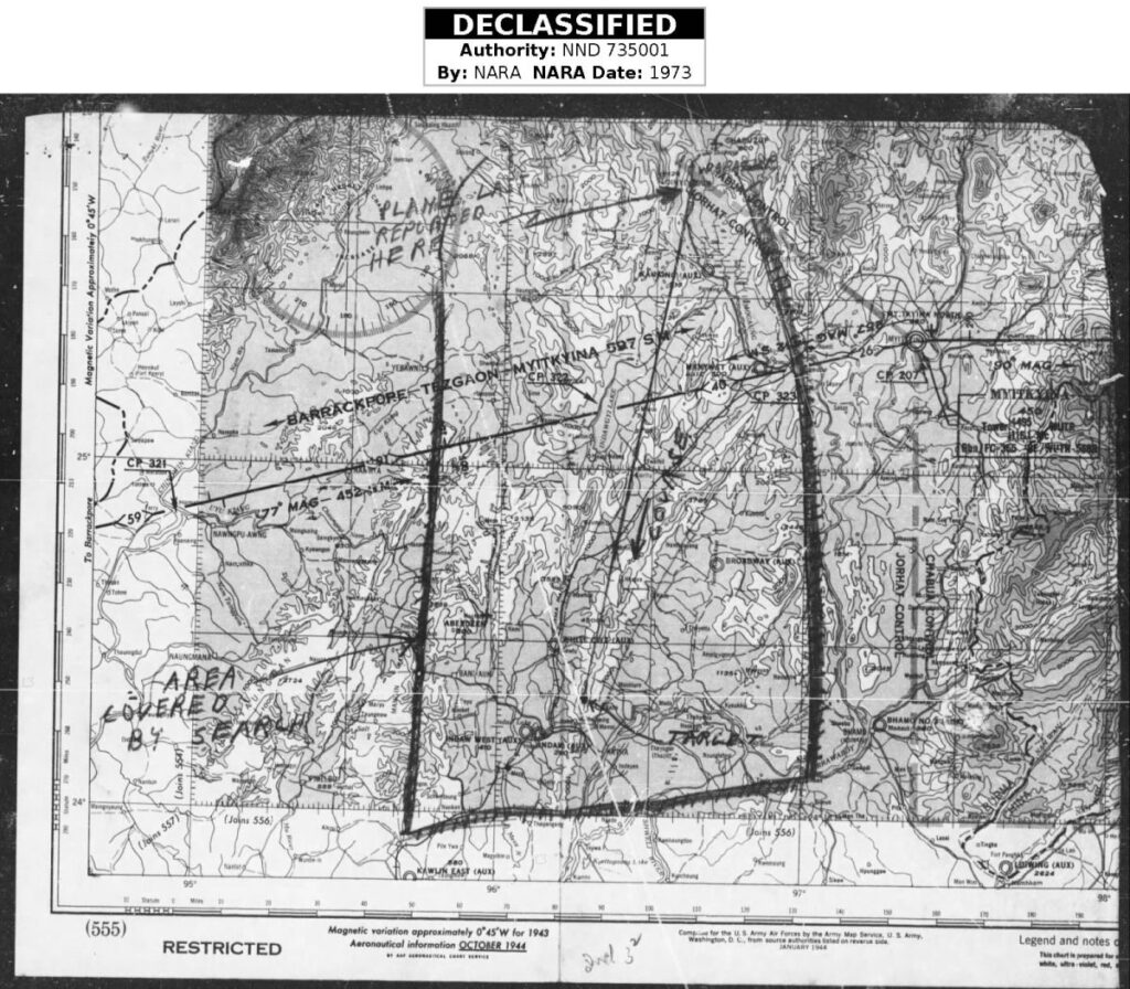 Anisakan airstrip4 is located about 30 km east of Mandalay (Google Maps link). The “40 miles [75 km] west of Anisakan” actually put Greco’s point of disappearance about 25 km west of Mandalay, a far better known landmark in Burma. Per Shores (see below), if Greco’s flight did not find enemy aircraft at the destination designated as their (initial) target, Shwebo, they were to move on to Anisakan in search of the enemy. Hence the reference to Anisakan rather than Mandalay:5