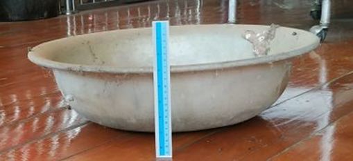 Obviously made of aluminum, it appeared to me to be too perfectly formed to have been the product of a manual peening process: it was more likely the product of a machine shop. There are concentric rings in the exterior curved surface which tend to suggest the surface of a machined die. However, the lip of the container does show numerous peening marks indicating the lip was given final touches manually. The piece is heavy, not made of the same type of soft aluminum used in present day cookware: