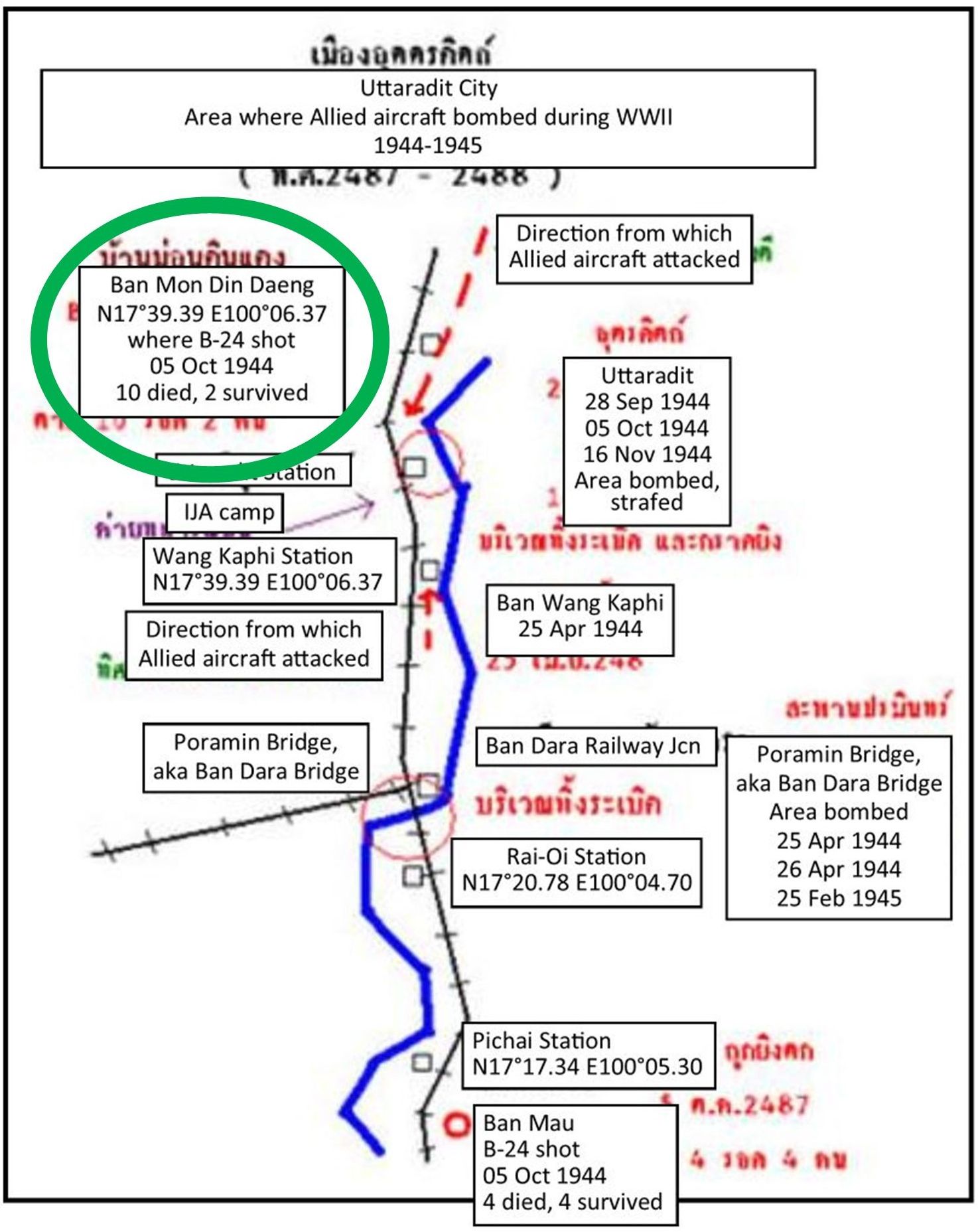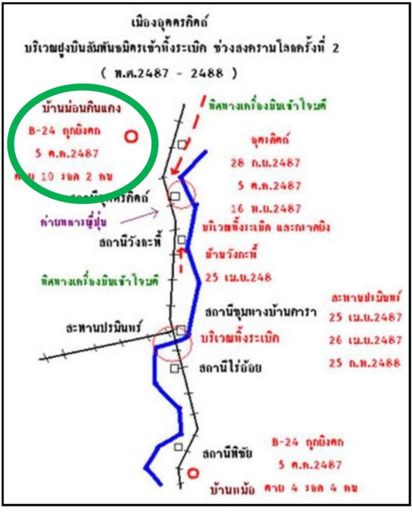 It was subsequently lost when the 2Bangkok website was hacked and destroyed. However, the map had been preserved in a 2013 blog by “Konsilaat” in บ้านเกศวุฒิ 11 (but since dropped) and was brought to my attention by Ben Svasti.2 While the source of the map is not now known,3 it is significant because it gives a name for the location of the crash of a B-24 to the north of Uttaradit, Ban Mon Din Daeng, in which two crew members survived (circled):