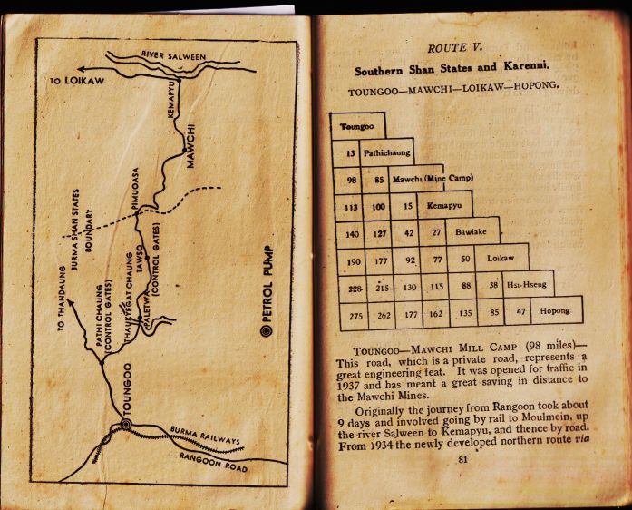 [p 82]. . . The 13 miles from Toungoo to Pathichaung [~Thandaung] is more or less flat. At Pathichaung the Mawchi road forks right from the Toungoo-Thandaung road . . . .