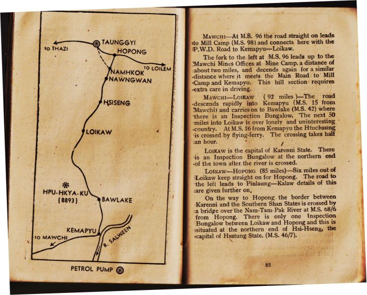 [p 85] Mawchi一At MS 96 the road straight on leads to Mill Camp (MS 98) and connects here with the PWD Road to Kemapyu—Loikaw. The fork to the left at MS 96 leads up to the Mawchi Mines Offices at Mine Camp, a distance of about two miles, . . .