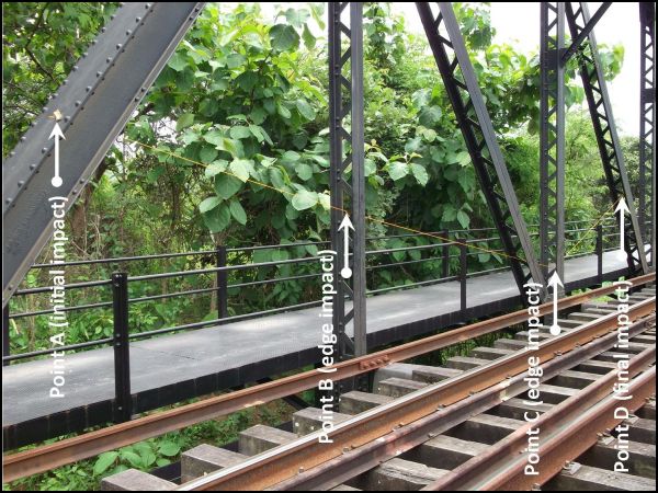 The projectile passed through the bridge member and started to tumble as it continued through the truss.