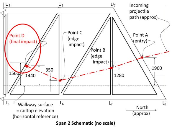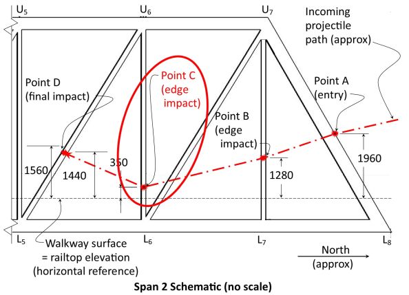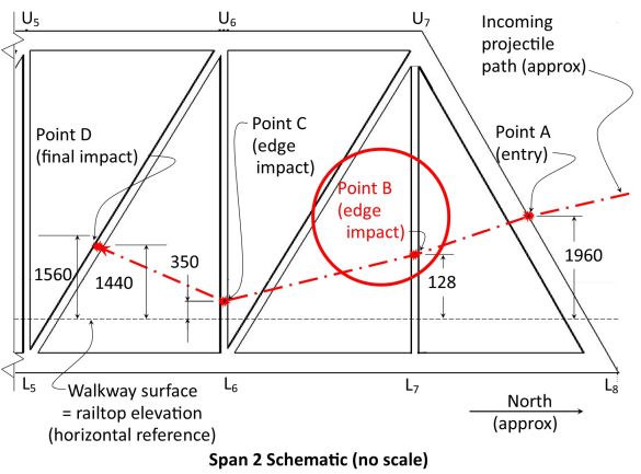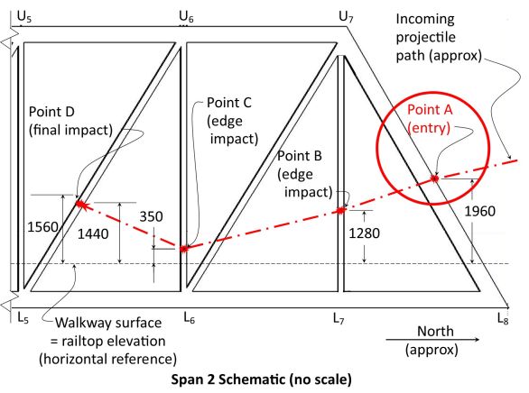 A projectile fired from north of the bridge passed through a 10mm (3/8 in) structural steel plate in the east leg of the north portal frame of Span 2:10