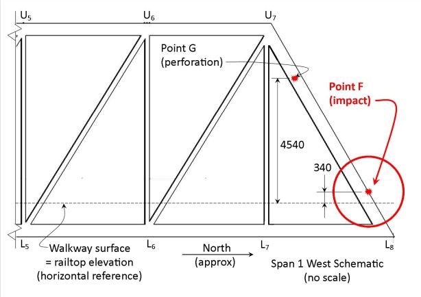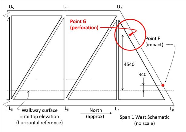 Again, as with Points B and C, the mark is primarily on a 10mm (3/8 in) thick structural steel lattice or lacing strap, but in lateral built-up chord U6L5 in Panel 6. Front view of Point D impact, looking SSE and level:22