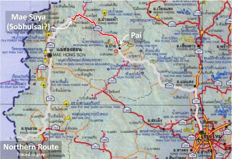 The eastern anchor point, “San Mahason”, assumed to be now Mahaphon, is in Amphur Mae Taeng, about five kilometers north of Mae Malai where the old road from Chiang Mai actually turned west towards Pai. The route, sketched in below as implied by its general description, suggests that whoever was “interrogated” was either not very familiar with the local geography or was intentionally trying to mislead his interrogators.11