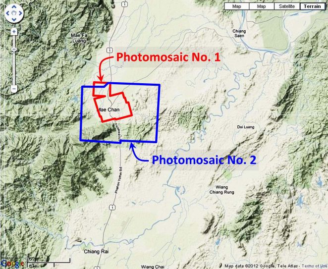 - Photos were assembled using Microsoft’s ICE (Image Composition Editor) as much as possible. Order of assembly was important: images 02501-02503 and 02505-02507 were assembled first and then joined. 02504 had to be manually added to the resulting composite because it did not sufficiently overlap with the other photos for the ICE program to stitch them together. Mosaic has been oriented so that north is top-of-page. My ref: \bPROJECT\_MAPS\THAILAND Maps\Williams-Hunt (WH) Aerials\CNR\CNR realigned OK\CNR composite#2 2501-2507 Mae Chan ok\02501-3,5-7+4_stitchaa-tilt.jpg[↩]