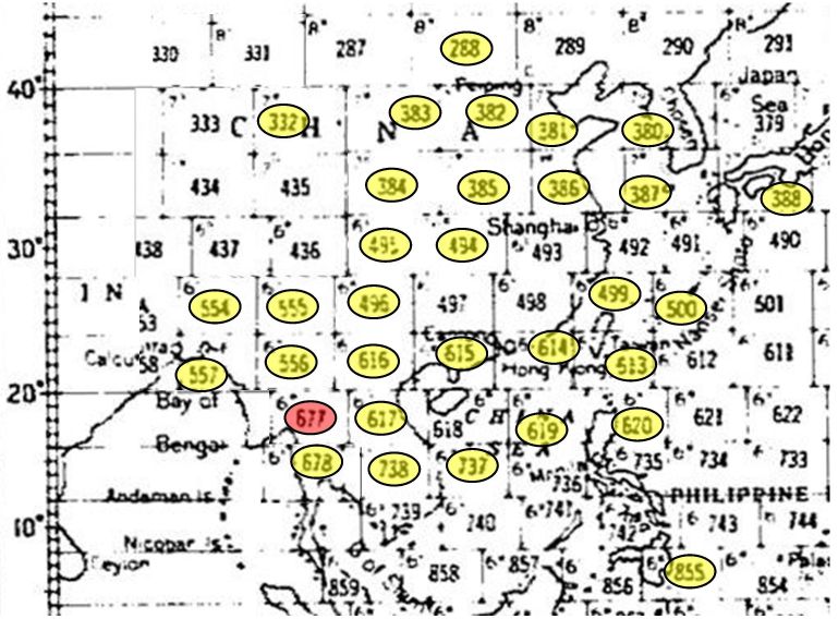 Reassembled charts which are available for download in the list following are highlighted in yellow. I note with some irony that I’ve not found the single chart highlighted in red, 677 — it is what I specifically wanted for this project which focused originally just on northwest Thailand, and it is what started this exercise. All that I found are included here because they seem to be the only source for this edition, 1942, and presumably would have been first used by the USAAF: