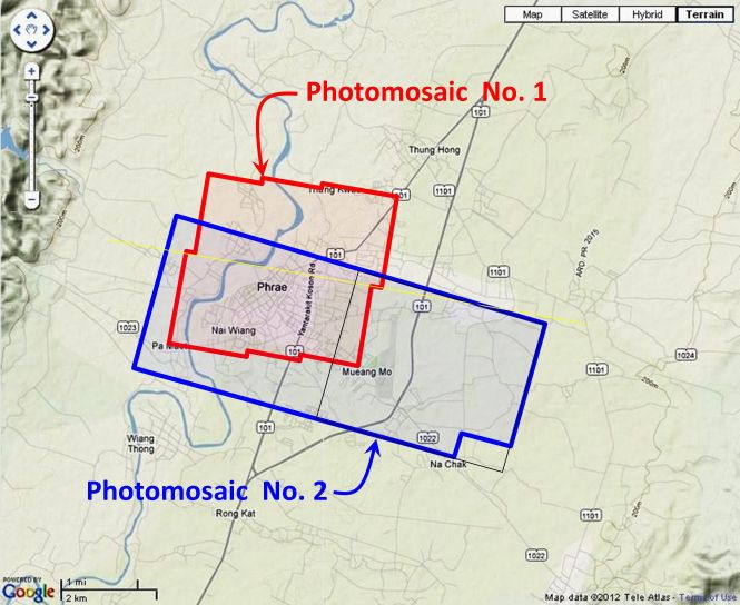 - “Terrain” map from Nations Online Project: Searchable Map and Satellite View of Thailand using Google Earth Data (link: http://www.nationsonline.org/oneworld/map/google_map_thailand.htm is no longer available). Annotation (red & blue colored items) placed with Microsoft Publisher by author; my ref: \02370 Phrae, KaengLuang\WH\Phrae photomosaic locatns.jpg[↩]