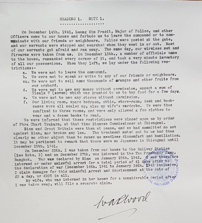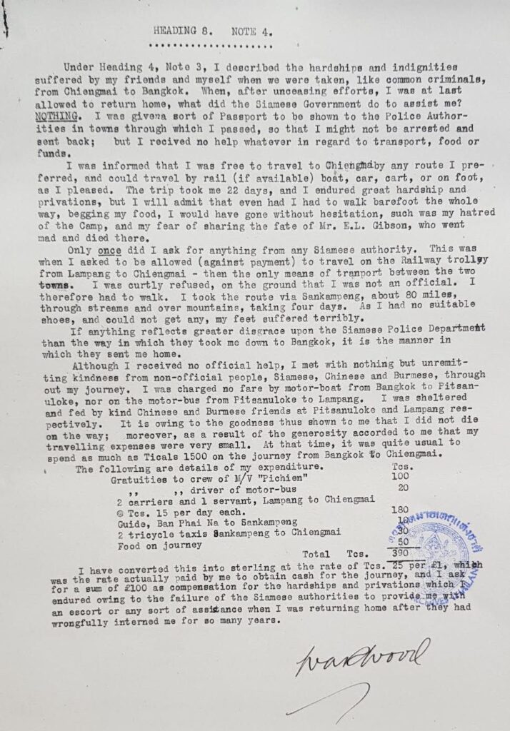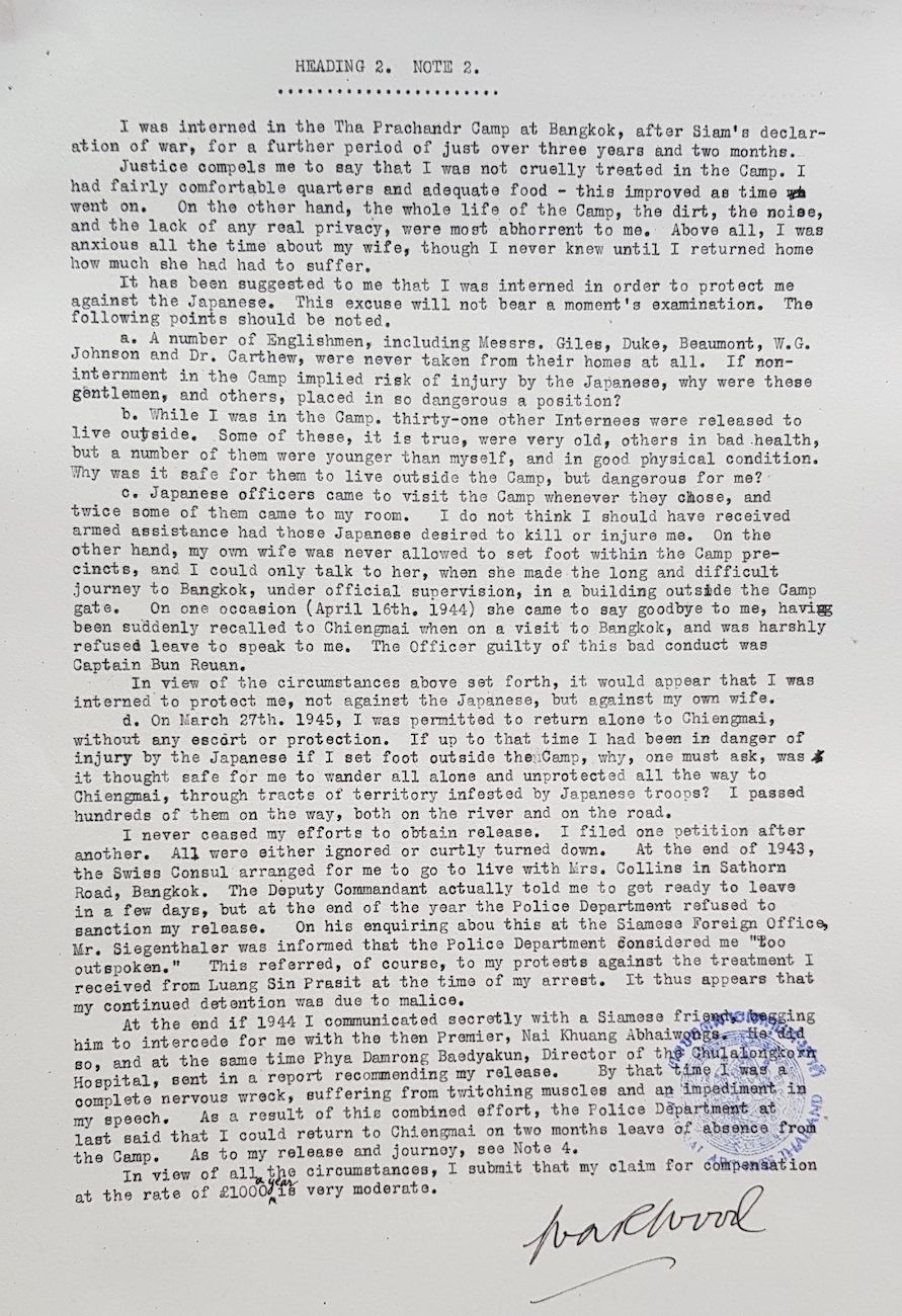 Wood, long retired British Consul in Chiang Mai19 made a post-war claim for unjust detention.20 The petition provides first hand observations of the difficulties that foreigners faced in detention in Thailand (transcripts follow the page images):