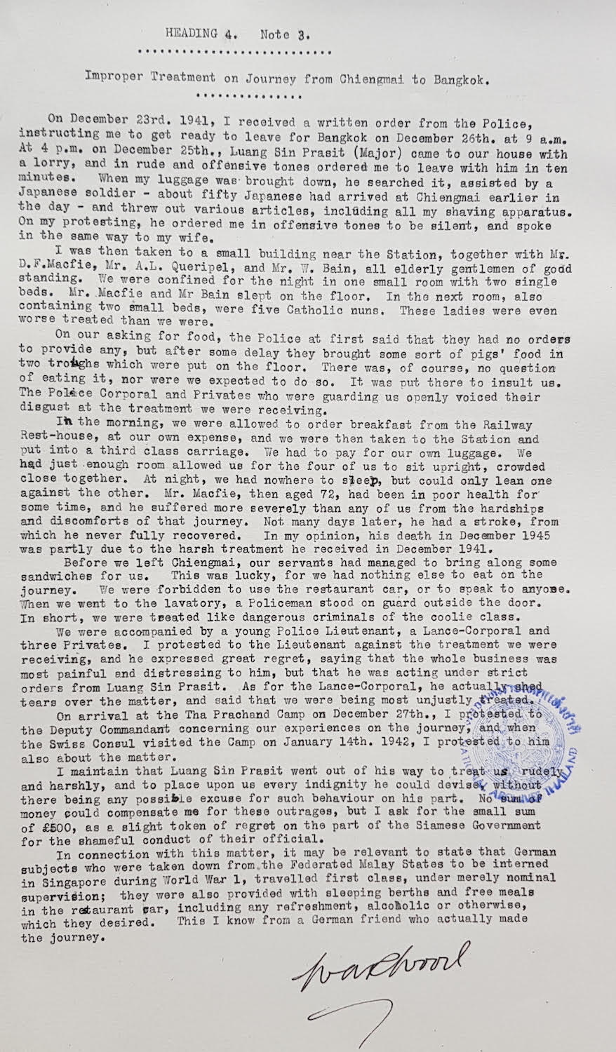On December 23rd. 1941, I received a written order from the Police, instructing me to get ready to leave for Bangkok on December 26th. At 9 a.m.. At 4 p.m. on 25th December., Luang Sin Prasit (Major) came to our house with a lorry, and in rude and offensive tones ordered me to leave with him in ten minutes. When my luggage was brought down, he searched it, assisted by a Japanese solder – about fifty Japanese had arrived at Chiengmai earlier in the day – and threw out various articles, including all my shaving apparatus. On my protesting, he ordered me in offensive tones to be silent, and spoke in the same way to my wife.