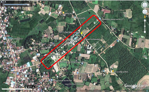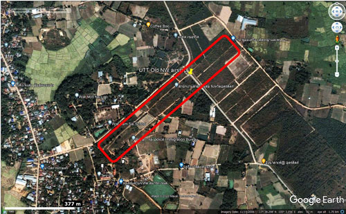 - Extract from Google Earth dated 2007, marked up by author using Microsoft Publisher; my ref: \02510 Air facilities, TH\Breakouts\Uttaradit\2007 GE\2007.pub, sht 1.[↩]