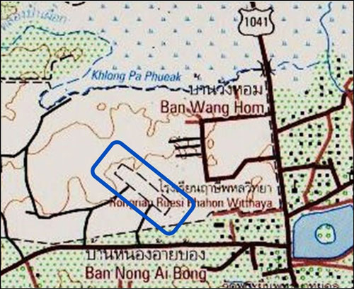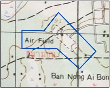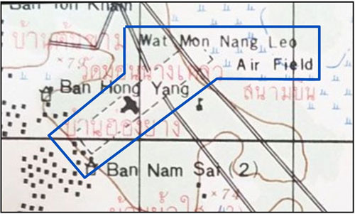 The airstrip scales to 3,300 feet long x 600 feet wide on a heading of 05-23. The Wat Mon Nang Leo is probably a very rustic Wat Mon Na Liao,12 (Google Maps link) north off the SW corner of the airfield.