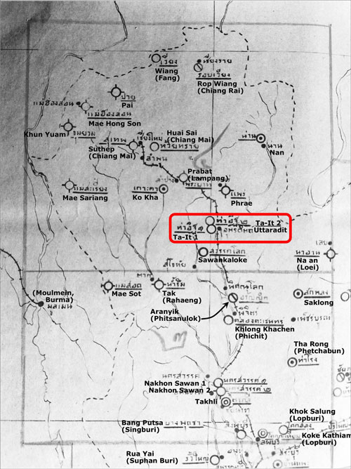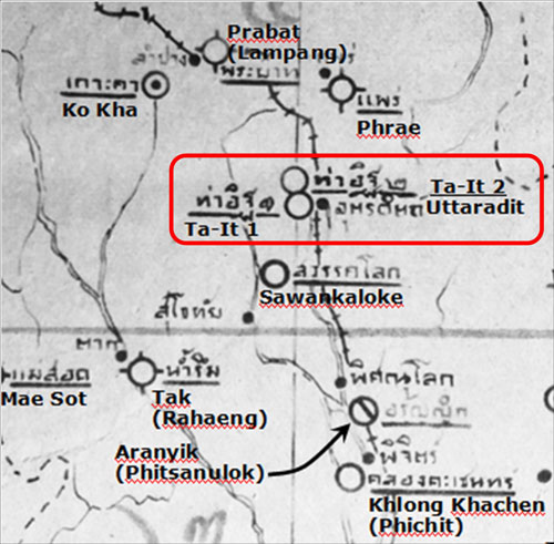 1953: Map of airfields in northern Thailand. Two items are shown for Uttaradit: Tha-It 1 and Tha-It 2. The town named Uttaradit covers the whole subdistrict or tambon of Tha It. Somewhat confusingly, the whole of the town of Uttaradit is located in the subdistrict of Tha-It which is in turn located in the district named Uttaradit which is part of the province of Uttaradit:1