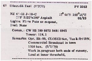 While Uttaradit Northwest and VTPU Uttaradit go as far back as (at least) 1969, Uttaradit Northeast appears only on this 1983 TPC. This TPC has only been updated by NOTAMs25 since 1983 and now there are no NOTAMs outstanding for any facilities in Uttaradit.