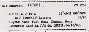 - Uttaradit Northwest, runway 2900 feet long, with unknown surface, elev 269.