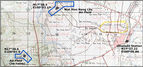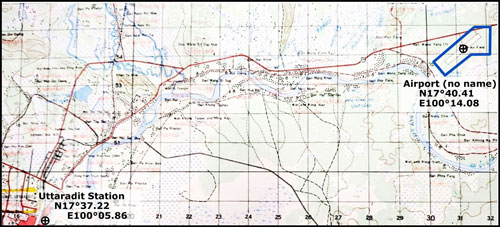 - N17°38.4 E100°03.16; extract from Google Earth dated 2007, marked up by author using Microsoft Publisher; my ref: \02510 Air facilities, TH\Breakouts\Uttaradit\2007 GE\2007.pub, sht 7.[↩]