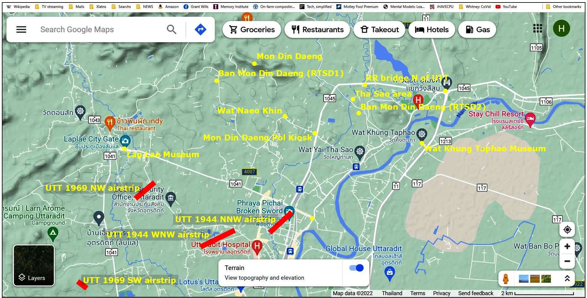 Significant features on the west and north sides of Uttaradit town, with the four WWII former airstrips highlighted in red:32