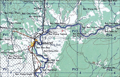 - Extract from Series L509, Sheet NE47-11, Edition 1-AMS “Uttaradit”, (offsite link; First Printing 8-58). US Army Service, Compiled from 1955, 1956 data. Scale 1:250,000. Gridlines are spaced at 10 km. Downloaded from University of Texas, Perry-Castañeda Library Map Collection Thailand Maps.[↩]